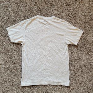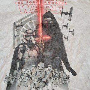 This Star Wars the Force Awakens white t-shirt features Kylo Ren, storm troopers, and tie fighters. It's a men's size medium and made of 100% cotton.