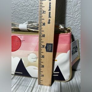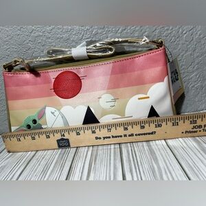 Adorable Star Wars x Danielle Nicole crossbody bag featuring The Child (Grogu/Baby Yoda) in a unique sunset landscape design. This bag has a crossbody strap, gold-tone hardware, and a sleek zip-top closure. Perfect for Star Wars fans, Disney lovers, or anyone who loves cute statement accessories.