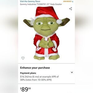 Greet your holiday guests at the door with this large plush Yoda! Adorable indoor plush decor. Ready for the holidays dressed in his Santa outfit. A fun way to welcome friends. 21" tall