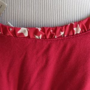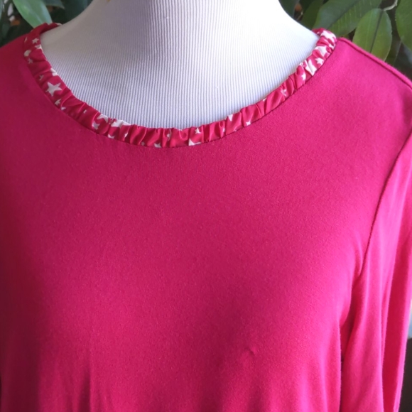 Tunic by logo. Has a contrasting red print collar./ Star printed ruched neckline Back is longer. Rayon/span material!Cuffs go to elbow almost.