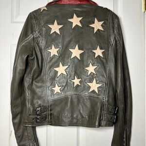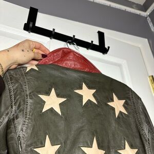 mauritius olive leather jacket with white stars and red detail- Size 10 but fits more like 8, very cute as an oversized piece- BRAND NEW TAGS STILL ON. Perfect for adding a bold touch to any outfit