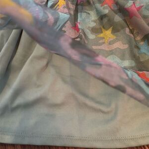 This Star Wars tutu skirt for girls features a camo pattern with multicolor stars and a Baby Yoda theme. Made from soft, breathable fabric, it offers comfort with an elastic waistband. Suitable for casual occasions, it is designed for all seasons. The skirt is in pre-owned condition.