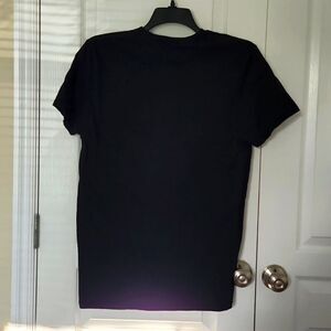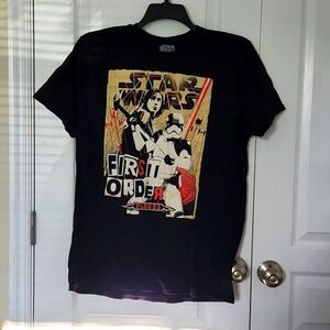 Black Star Wars shirt. Has different colors and symbols on the front. The material is 100% Cotton.