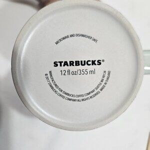 Elegant ceramic mug from Starbucks, holding 12 fluid ounces. Features a stylish pink and blue pattern on the base. Microwave and dishwasher safe.