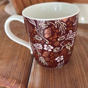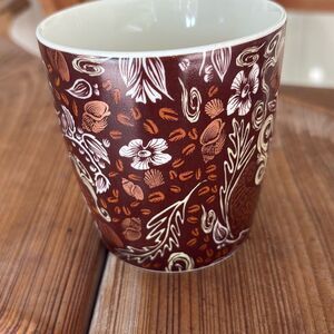 Starbucks 2009 Anniversary Blend mug featuring the iconic mermaid siren logo in copper-brown tones. This design was a part of the Starbucks collection in 2009, and the siren, a mythological figure, has been a central part of the brand's identity since its early days. The design is inspired by a 16th-century Norse woodcut of a twin-tailed mermaid, and the siren was chosen to symbolize the alluring and irresistible nature of coffee. The mug is made of bone china and is suitable for both microwave and dishwasher use.