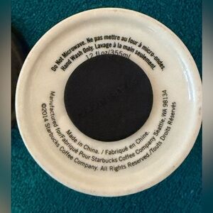The product is a Starbucks 2014 Metallic Flecks Ceramic Travel Mug with a black lid, holding 12 oz. It features a multi-color design and is an original piece from China. The mug is designed for coffee and tea enthusiasts and serves as a collectible advertising item for Starbucks.