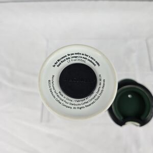 Starbucks 2014 Travel Mug Ceramic Lid White Strands Green Gold Circle Patch 12oz