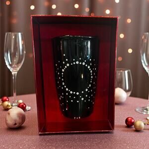 Stunning and rare, this Starbucks 2015 Swarovski Crystal Black Ceramic Tumbler features a glossy black finish and a sparkling Swarovski crystal design arranged in a beautiful circular/starburst pattern. This limited-edition release is highly collectible and especially hard to find brand new with tag and in the original box.