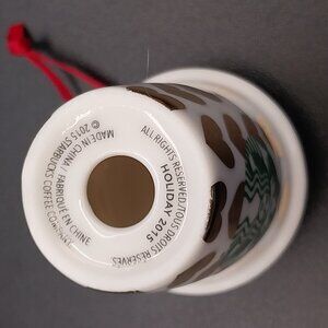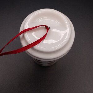 It is a miniature ceramic ornament designed to resemble a Starbucks to-go coffee cup.