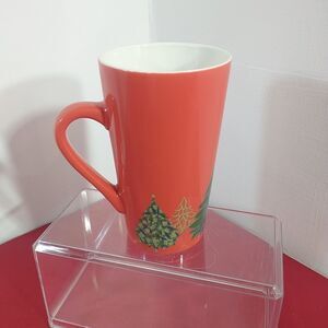 Festive red Starbucks mug with holiday tree design. Perfect for coffee lovers.