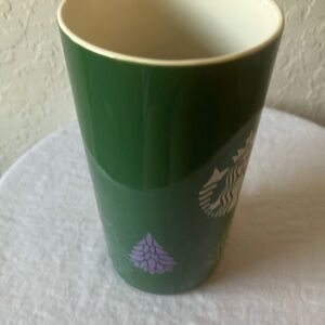 Green ceramic mug featuring the Starbucks logo and a purple tree design. Perfect for coffee lovers.