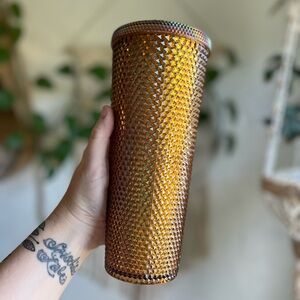 Limited Edition Starbucks 50th Anniversary studded cold cup tumbler in a stunning gold copper iridescent finish. 24 oz Venti size with faceted studded texture and embossed Siren logo. This collectible was released in 2021 and is a must-have for any Starbucks tumbler fan! Durable, BPA-free, and hand wash only.