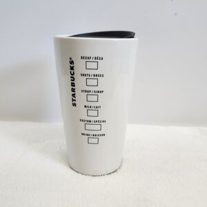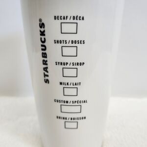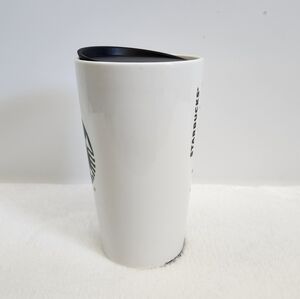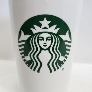 Starbucks 2021 Classic Ceramic White Green Traveler Tumbler Coffee Cup Mug. 12 oz, large green Siren Mermaid logo, black Starbucks logo on other side along with drink charts, black removable lid with silicone seal. No cracks, chips or stains. Like new condition! 2 tumblers available! Bundle & save!