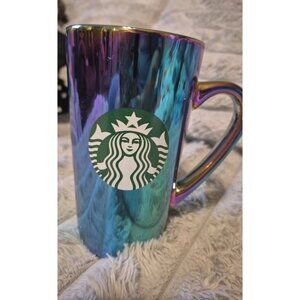 The Starbucks 2022 Iridescent Rainbow/Oil Slick 16oz Tall Ceramic Coffee Mug is a colorful and unique collectors' item featuring the iconic Starbucks brand. This original cup is designed with a vibrant multi-color rainbow/oil slick pattern, perfect for coffee and tea enthusiasts. Made in China, this mug combines style and functionality in one elegant piece, making it a must-have for any Starbucks fan or collector alike.
