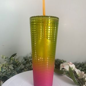 Starbucks 2022 Lemon Yellow Pink Gradient Ombre Gradient Grid 24oz Venti Tumbler