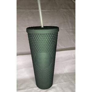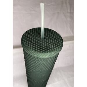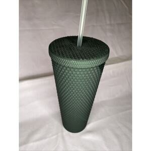 The Starbucks 2022 Matte Green Studded Spiked Venti Tumbler Cold Cup 24 oz is a collectible item featuring a dark green color. It is an original creation by Starbucks, not a reproduction, with a theme centered around coffee and tea. This tumbler is adorned with studs and spikes, making it a unique and stylish addition to any collection. NEW STRAW ADDED