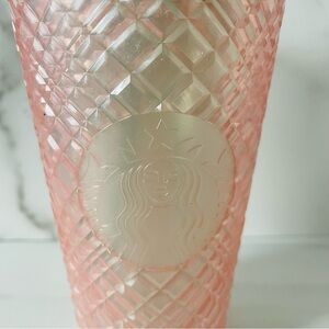 How pretty is this cup? The color is a mix of a pearlized pink with a jade green rim and straw. The texture is reminds me of jewels/cut stones. Or in a similar way, deep inset diamonds. Near the top is the the inlaid Starbucks Siren logo. Includes green straw. Top has the same color and texture. Top twists off. Cup is a bit on the heavier side. Such an unique cup that gives off all the sweet summery vibes.