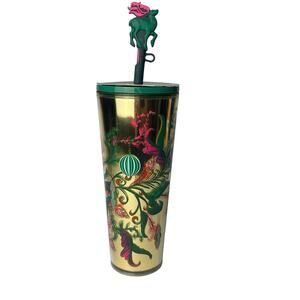 This 24oz. tumbler features a vibrant multi-color design with a reindeer straw topper. It is designed for cold beverages like iced coffee, cold brew, and teas. This limited-edition cup is a must-have for Starbucks enthusiasts and collectors.