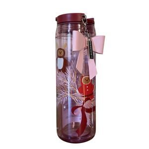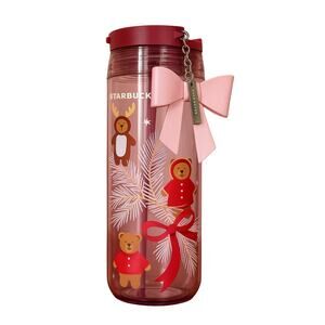 This festive tumbler features an adorable bear in a red sweater, pink ribbon charm, and wintry pine branch artwork. Its lightweight double-wall design keeps drinks insulated while the pastel pink lid and charm add a playful, feminine touch.