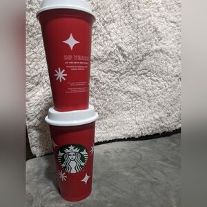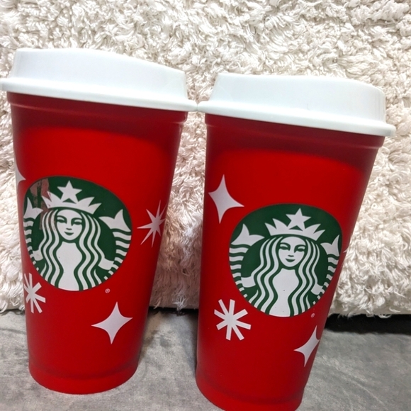 Starbucks 25th anniversary plastic 16 oz. With lids. Limited edition slight graphic damage on one other is flawless as is