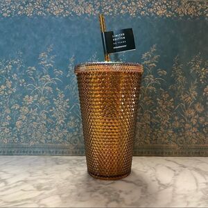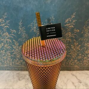 This Limited edition Starbucks tumbler is brand new and has never been used. It has the well known studded honeycomb pattern outside in a cool multi chrome that goes from dark orange to pink and yellow. The Starbucks logo is on the front. The straw has a swirl pattern in it too! This tumbler is 16 oz.
