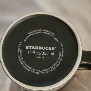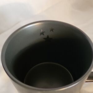 Sleek black mug with a shimmering silver band. Ideal for coffee lovers.