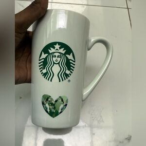 Elegant white mug with iconic green Starbucks logo and heart design. Ideal for coffee enthusiasts.