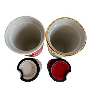 This set of Starbucks ceramic travel mugs combines vibrant artistry with functional design. Featuring a red chevron pattern and floral motif, these 12 oz mugs include silicone lids for spill-free sipping. Crafted from durable ceramic, they're ideal for coffee or tea on the go. A delightful addition for collectors or everyday use.