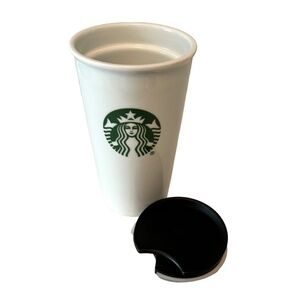 Classic Starbucks ceramic 10 oz travel mug with swivel open lid and an 8 oz handled mug.