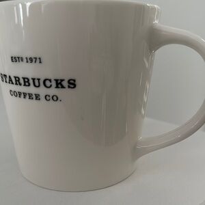This oversized Starbucks mug features striking black lettering that reads "STARBUCKS COFFEE CO." and "EST. 1971" on two sides. It is in great condition, no chips or cracks or crazing. There is possibly some discoloration inside, and there is one small black mark near the text, please see pictures.