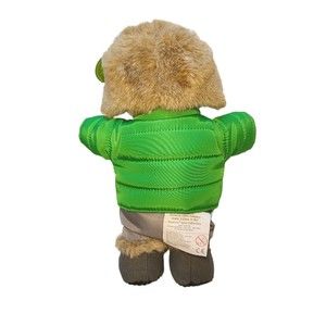Green Puffer Jacket Grey Snow Pants Grey Corduroy Boots with Tan Faux Fur Trim Tan Faux Fur Trapper Hat Approximately 11 Inches Tall and 8 Inches Arm Span Width Material Polyester Fibers and PE Pellets