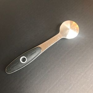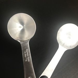 Stainless steel with black rubber bottom espresso measuring spoon. Top flips open and you slide it back after filling it up with espresso.