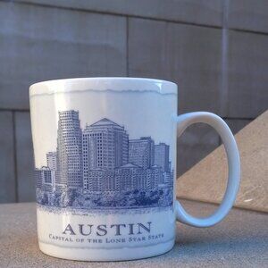 Awesome 2008 Architectural Series Mug from Starbucks Coffee, featuring Austin Texas, the Lone Star State's favorite City. Holds 18 fl oz. Unblemished bone white interior. "Starbucks" on the handle. Clear mark on base. Excellent condition. Issued in 2008. There are fewer around every day to commemorate the spirit and the morning. Great broad mug. Feels great in the hand
