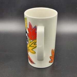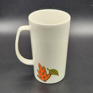 This is a 16-ounce ceramic Starbucks Fall Leaves mug. The mug is a milky white color with orange and yellow leaves outlined in green. The Starbucks logo is black and white. The mug measures approximately 6 inches tall and approximately 3.5 inches across at its mouth. Markings on the bottom indicate that it is microwave and dishwasher safe.