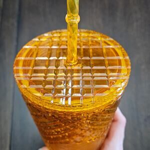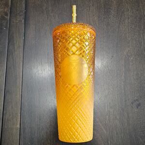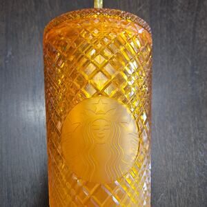 A vibrant amber-hued, diamond-textured Starbucks cold cup—perfect for iced coffees, teas, and smoothies. This 24 oz reusable tumbler features the signature raised siren logo, a matching amber straw, and screw-on lid to keep your drink secure and spill-free.