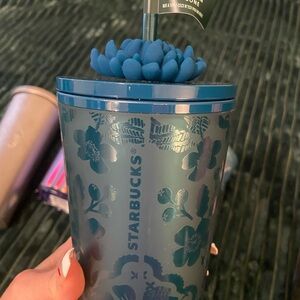 5) The teal cup with the silicone flower topper is new never used