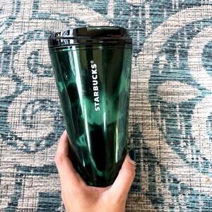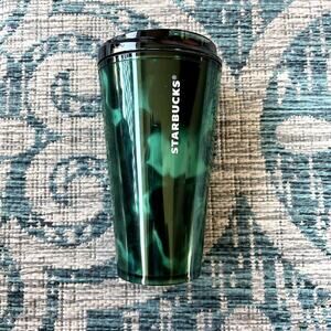 Enjoy your favorite iced beverages in style with this reusable Starbucks tumbler. The 16 fl oz capacity is equivalent to a Grande size, perfect for a refreshing cold drink. It features a unique, dark green marbled or swirl design that gives it a stylish and modern look. The tumbler comes with a secure, black lid with a flip-top opening to prevent spills. It is designed to be durable and is a great way to reduce waste while enjoying your coffee or tea on the go.