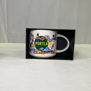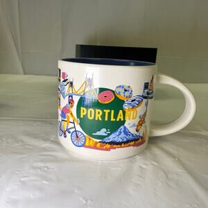 Celebrate the charm of Portland with this Starbucks Discovery Series collectible mug. This 14 fl oz ceramic mug features vibrant artwork highlighting iconic Portland symbols like bridges, bikes, donuts, and Mount Hood, with a bold green “PORTLAND” graphic at the center. The design wraps around the mug, capturing the city’s unique culture and energy. The interior has a striking deep blue finish for a modern look.