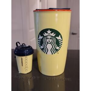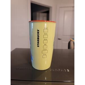 Disney collaborates with Starbucks on this 12oz yellow ceramic tumbler featuring classic Minnie Mouse wearing a blue polka dot dress surrounded by attractions like Haunted Mansion and the Sleeping Beauty Castle. Holds hot beverages.