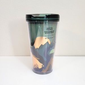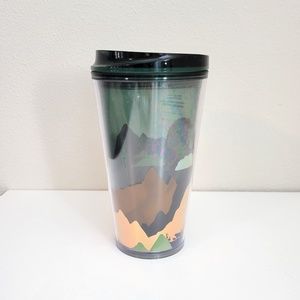 New, never used! 16 oz. Green and brown mountain scene landscape with gold foil accents. There is some "rainbowing" (see photos) but it is within the double walled plastic. The cup is brand new though. The lid is a screw-on sipper with a slider.