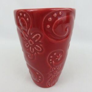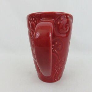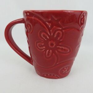 This is a red oblong shaped Starbucks coffee mug featuring embossed flowers, dots, swirls and stars: