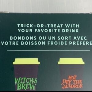 Starbucks Halloween themed hot cups feature glow-in-dark features. You get 6 individual hot cups. Each has a glow-in-the-dark lid. Titles on the cups say "Witch's Brew" "Hot off the Cauldron", "Siren Potion", "Freshly Brewed", "Goblin Juice", and "Dark Roast". Do not microwave; Top-rack dishwasher safe cup; hand-wash lids; follow instructions prior to use to activate glow-in-the-dark lids.