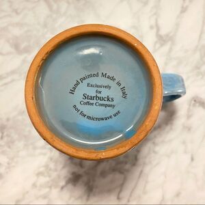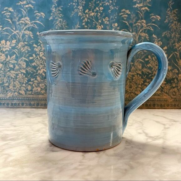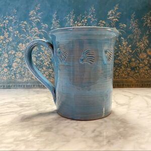 This clay handmade mug is in excellent pre-owned condition except for one tiny chip on the rim (see pics). It is hand glazed blue with stamped sea shell designs along the top. It is made of red clay. It was made exclusively for Starbucks. It is approximately 4 1/2” tall and can hold 10-12 oz.