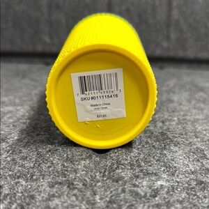 Vibrant yellow tumbler featuring a textured surface. Comes with a green straw and lid. Ideal for beverages on the go.