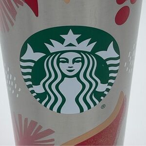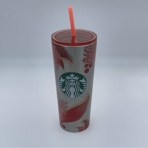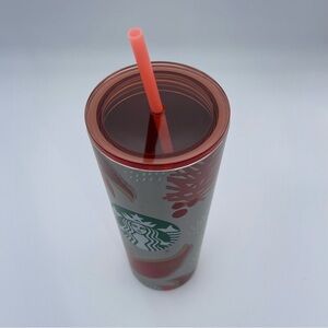 Limited Edition Starbucks Holiday 2021 tumbler with red lid and pink straw. Features festive red and silver floral/poinsettia print on a stainless steel body. 24 oz size, reusable and BPA-free.