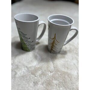 Starbucks Holiday Tree Mug Set Of two 12oz Ceramic Coffee Mugs Gold & Green Desi
