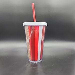 Starbucks Insulated Tumbler Cup is the perfect addition to your collection! It features glitter stripes and a 16 oz capacity, making it great for coffee or tea on the go. The tumbler is an original Starbucks item from 2018 and has not been modified in any way. It was made in China and is new with tags 2018 16 oz Cup without straw is 6.5" tall Screw on Lid New with original packaging