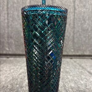 Elegant Starbucks tumbler with a textured design. Features an iridescent green finish. Comes with a matching straw.