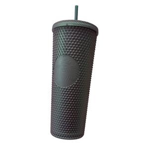 24 oz tumbler from Starbucks. Screw-on cap with straw. Dark green matte color with jelly studded "honeycomb" texture and Starbucks mermaid face logo. Excellent preowned condition. BPA Free.