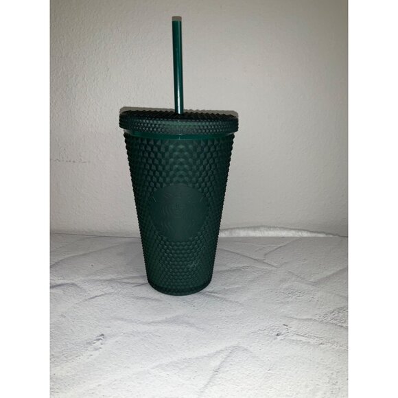 You are looking at a Starbucks Matte Green Soft touch studded 16 oz Tumbler used a few times!